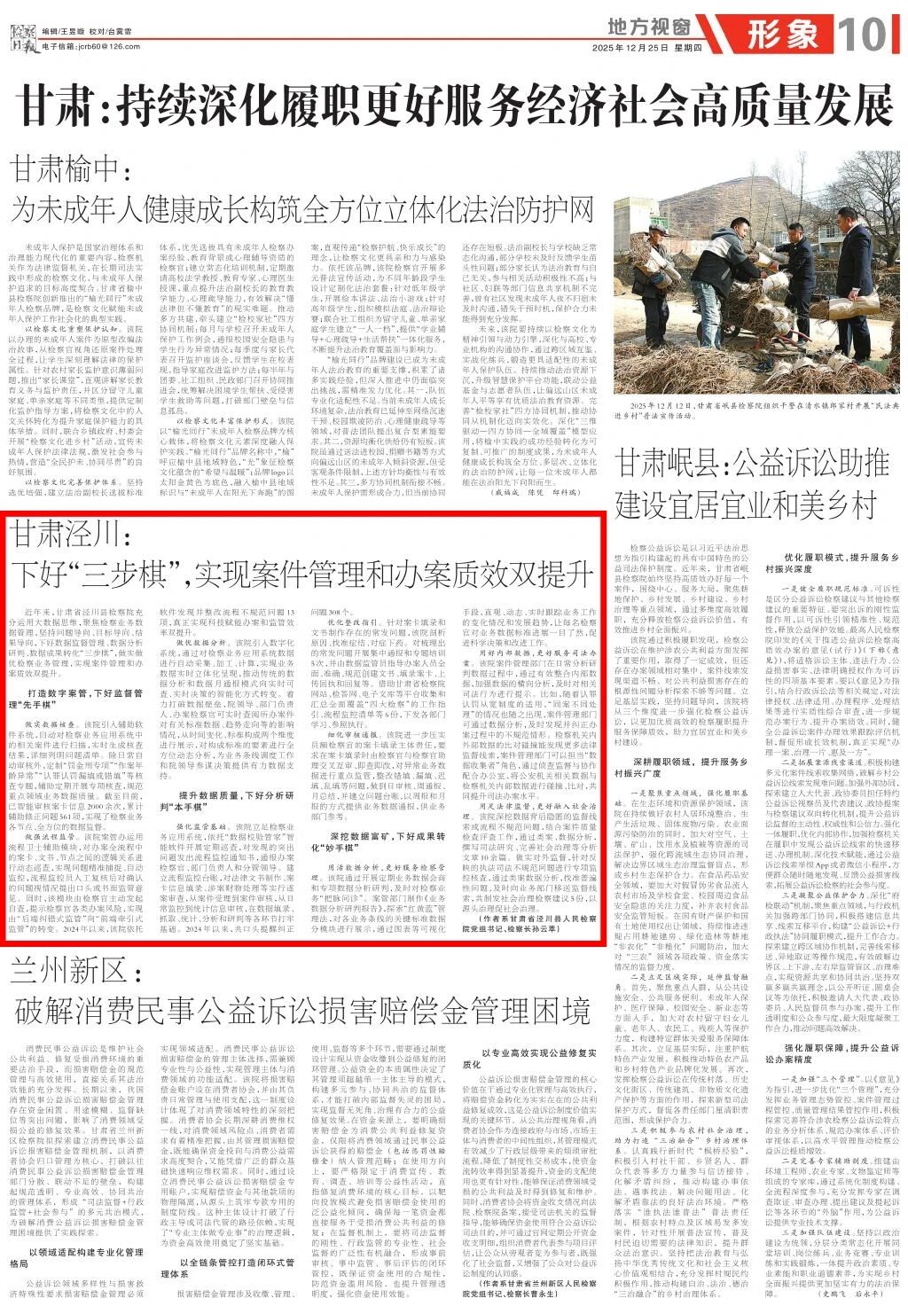2025年12月25日,检察日报地方视窗《甘肃:持续深化履职更好服务经济社会高质量发展》专版刊发《甘肃泾川:下好“三步棋”,实现案件管理和办案质效双提升》。