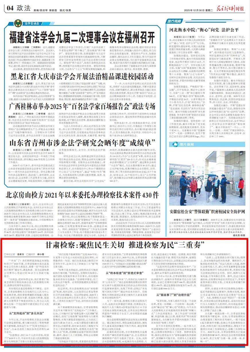2025年12月30日,民主与法制时报刊发《甘肃检察:聚焦民生关切 推进检察为民“三重奏”》。