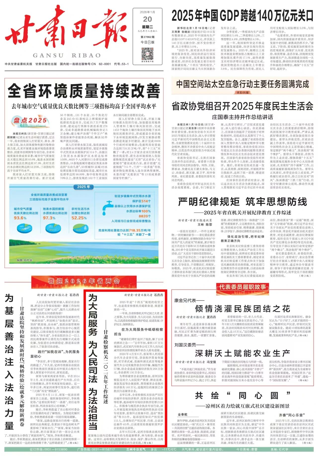 2026年1月20日,甘肃日报头版《喜迎2026年省两会》专栏刊发《为大局服务 为人民司法 为法治担当——1024核工厂