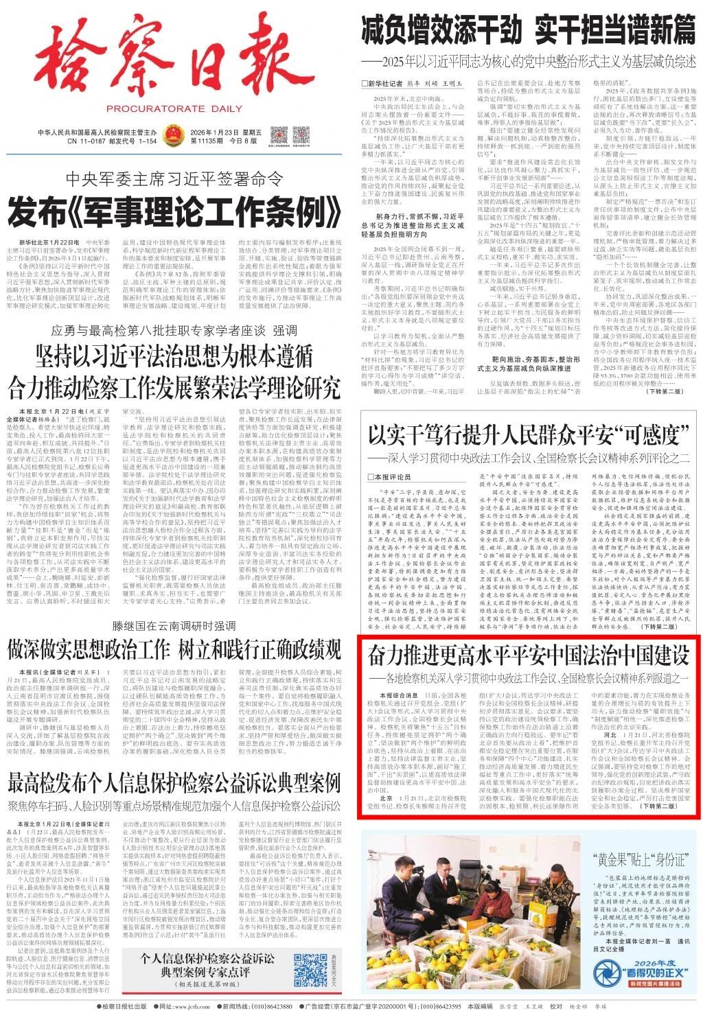 2026年1月23日,检察日报头版刊发《奋力推进更高水平平安中国法治中国建设——各地检察机关深入学习贯彻中央政法工作会议、全国检察长会议精神系列报道之一》。