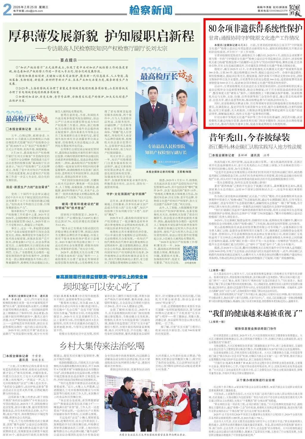2026年2月25日,检察日报刊发《80余项非遗获得系统性保护 甘肃:通报协同守护陇原文化遗产工作情况》。