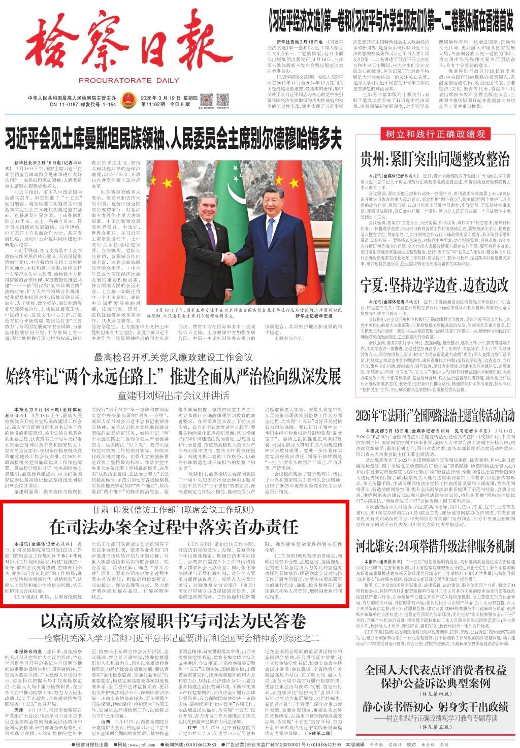 2026年3月19日,检察日报头版刊发《甘肃:印发〈信访工作部门联席会议工作规则〉 在司法办案全过程中落实首办责任》。