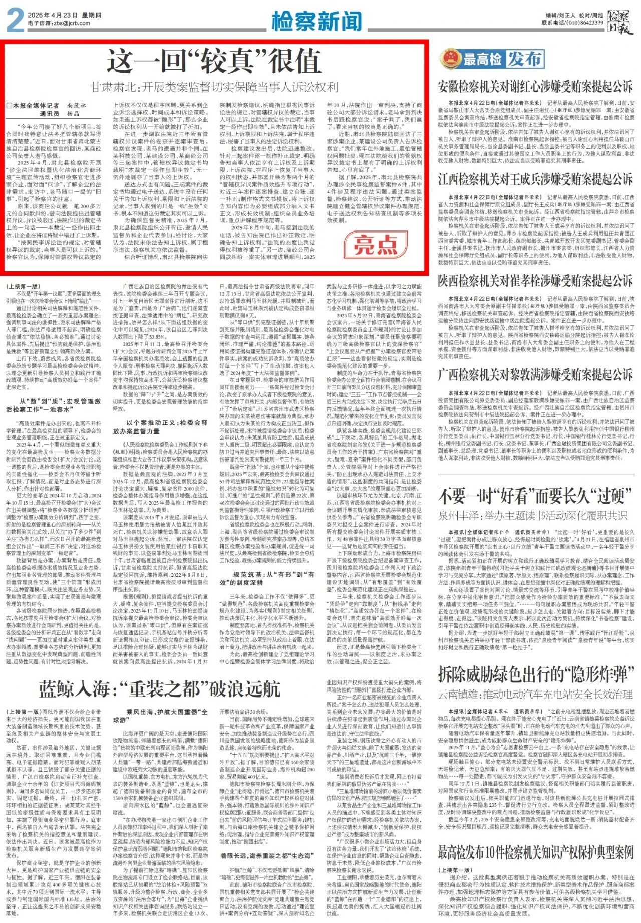 2026年4月23日,检察日报二版头条刊发《这一回“较真”很值 甘肃肃北:开展类案监督切实保障当事人诉讼权利》。