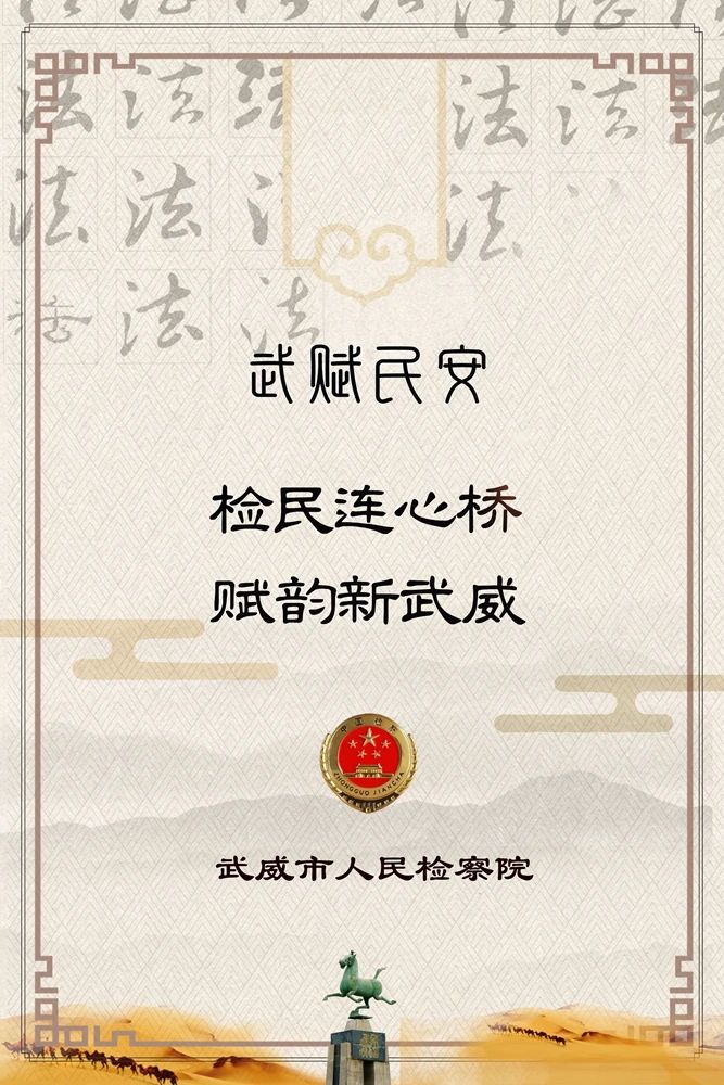 凉州七里十万家,胡人半解弹琵琶。武威自古以来就是诗的故乡。从醉卧沙场君莫笑到赋歌新时代,从一片孤城万仞山到走向新生活。质朴无华的武威人民,用勤劳实干将这个历时两千年的古州渲染的更加兴盛繁荣。而武威检察,在中国式现代化的宏伟蓝图中,坚守着司法为民的坚定信仰,用新时代愚公精神,在这大漠孤烟中用情用力书写了为民安、为民暖、为民兴的检察新赋。